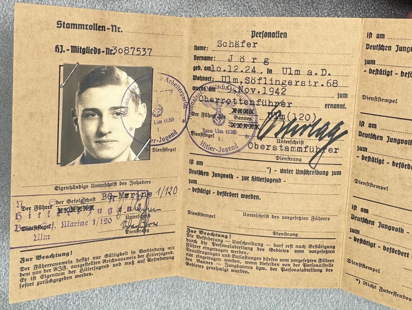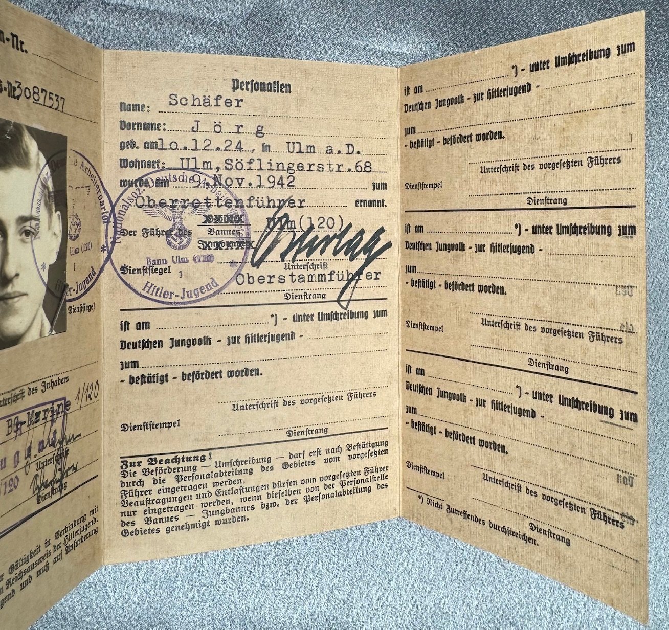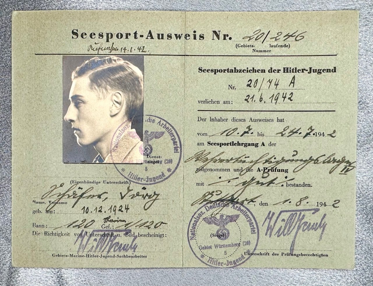 Three documents for Oberrottenfuhrer Jorg Schafer of Ulm for Marine HJ Bann Ulm 1/120 to include his Fuhrerausweis der Hitler-Jugend, Seesport Prüfungen der Marine Hitler Jugend, and his Prüfungenshest fur das Seespotabzeichen der HJ. Rare to find all 3 to one Marine Hitler Youth
