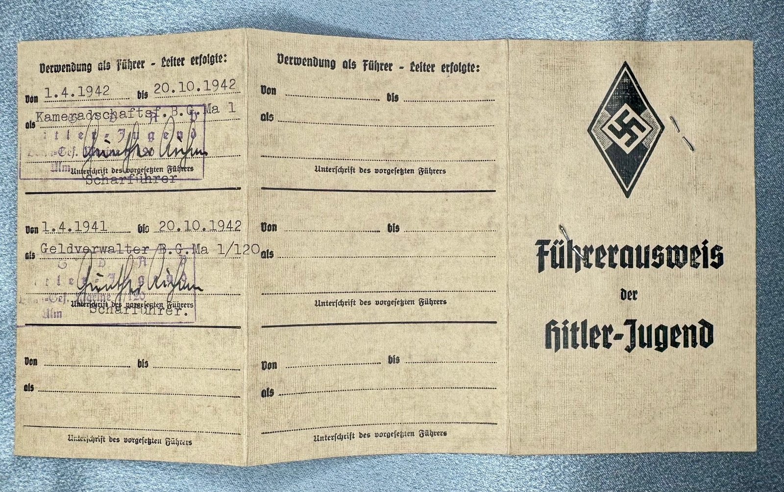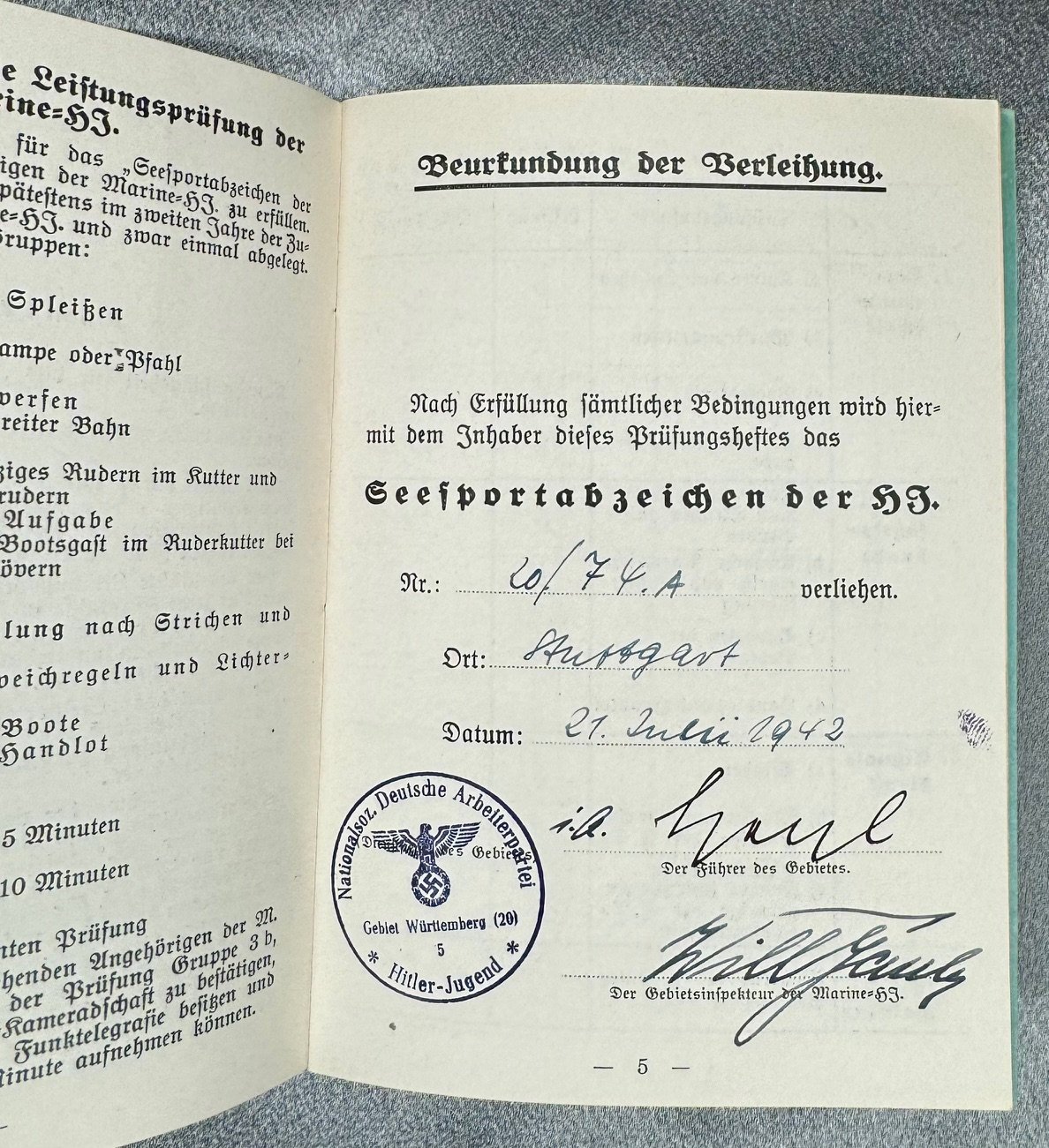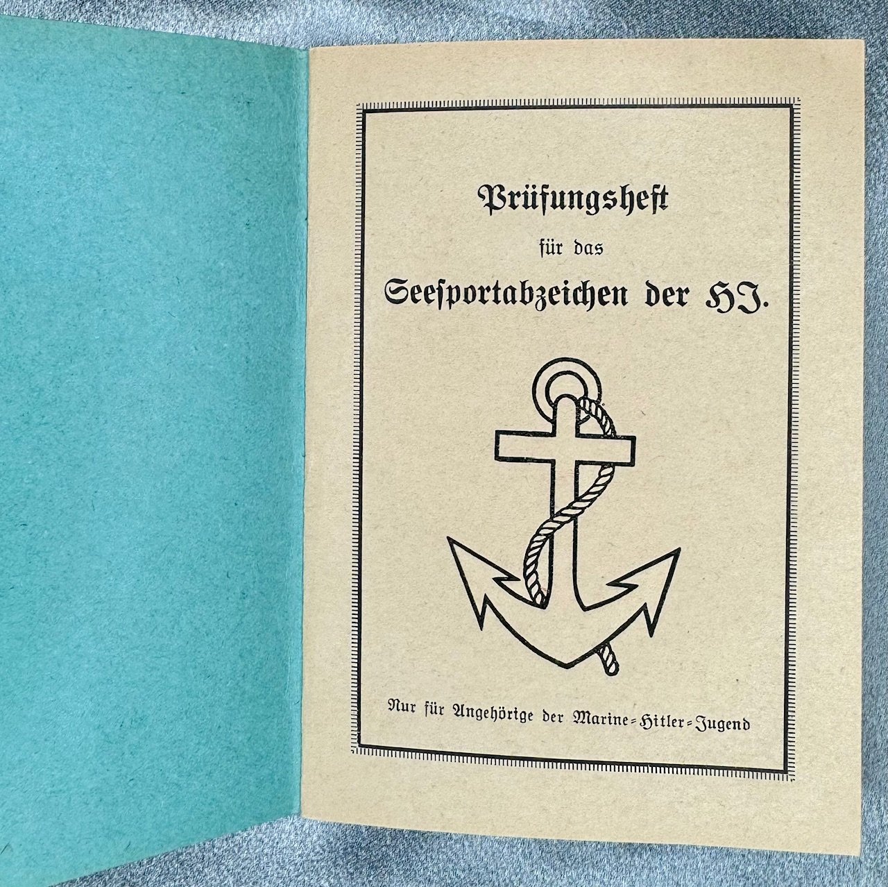 Three documents for Oberrottenfuhrer Jorg Schafer of Ulm for Marine HJ Bann Ulm 1/120 to include his Fuhrerausweis der Hitler-Jugend, Seesport Prüfungen der Marine Hitler Jugend, and his Prüfungenshest fur das Seespotabzeichen der HJ. Rare to find all 3 to one Marine Hitler Youth