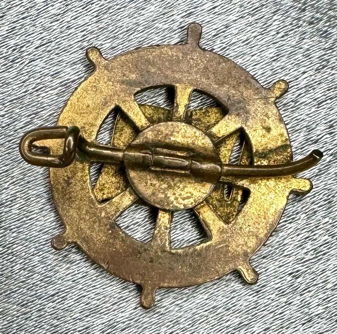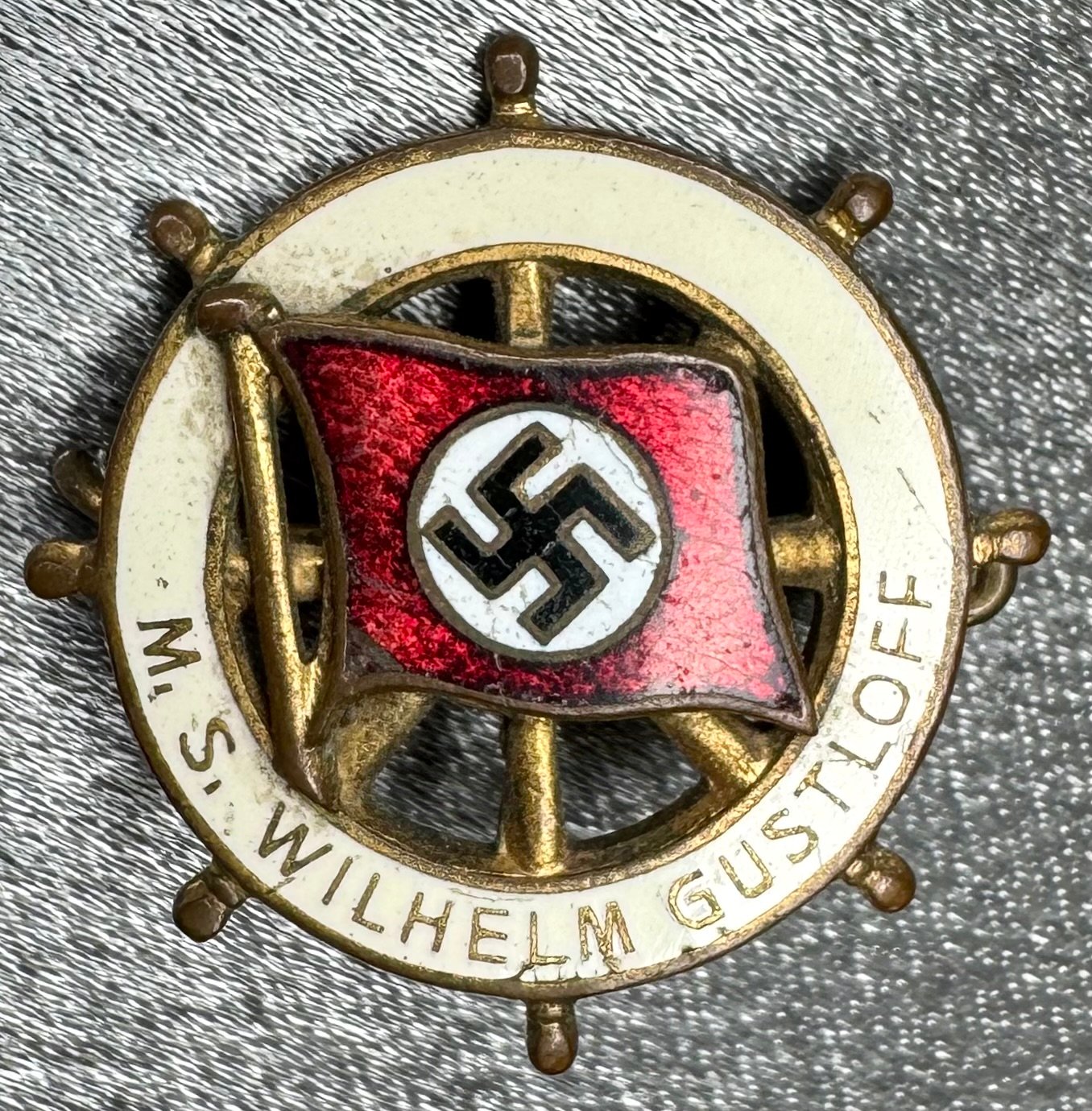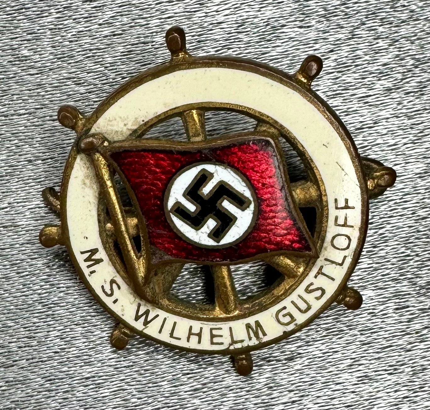 M. S. Wilhelm Gustloff Abzeichen. Steering wheel with National Socialist flag. Enamel to the front is excellent, reverse pin broken as shown. Rare to find these small souvenir pins, approx. 23mm in size