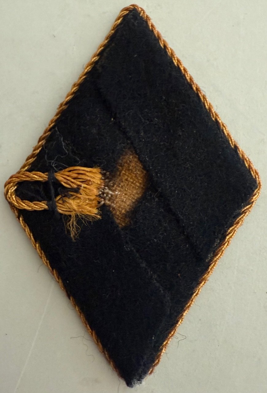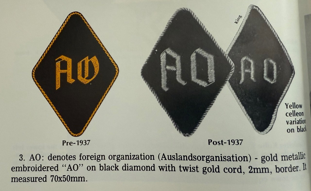 This is a scarce post-1937 sleeve diamond (worn on the left forearm sleeve of the tunic) for the Auslands Organization. This department was in place to provide oversight to Germans (specifically Party members) living abroad.