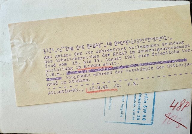 Otto Wächter and HJ Leader speaking in Krakau on Day of the NSDAP August 1941. Press photo, approx. 7" X 5" in size.