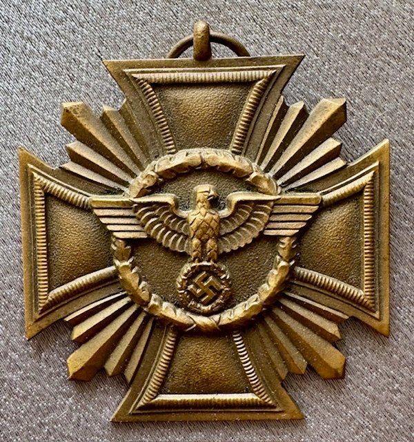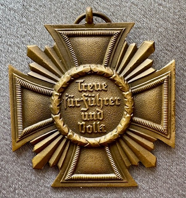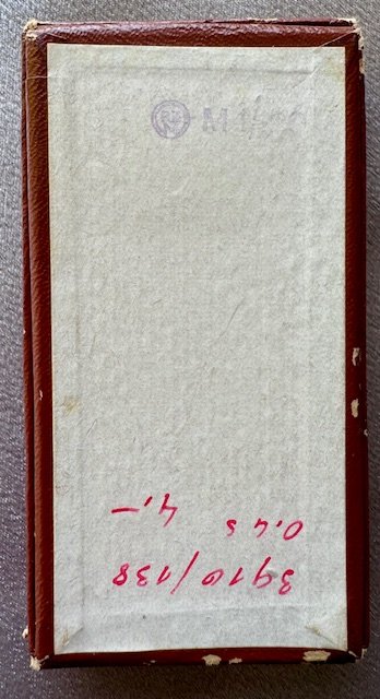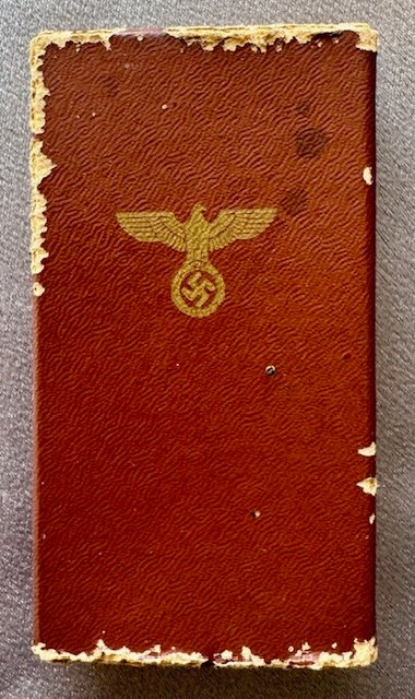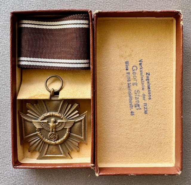NSDAP Long Service Award for 10 Years, with Case. The medal is unmarked, being the thin style, with full length ribbon. Includes the original case of issue. RZM "M1/120" maker marked on the back (difficult to read). "Zugelassene Verkaufsstelle der RZM - Georg Stangl, Wien" stamped inside.