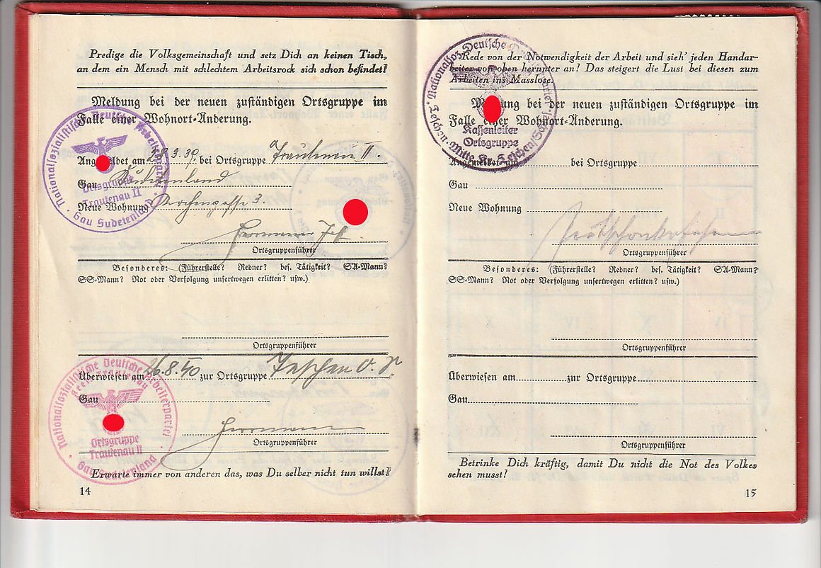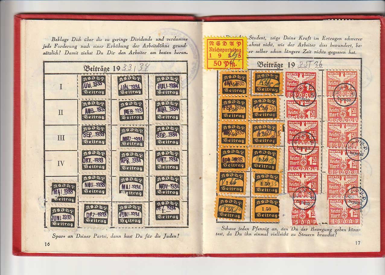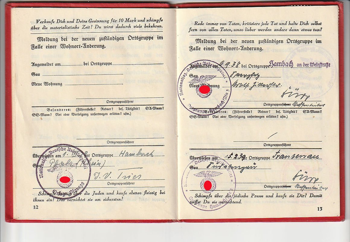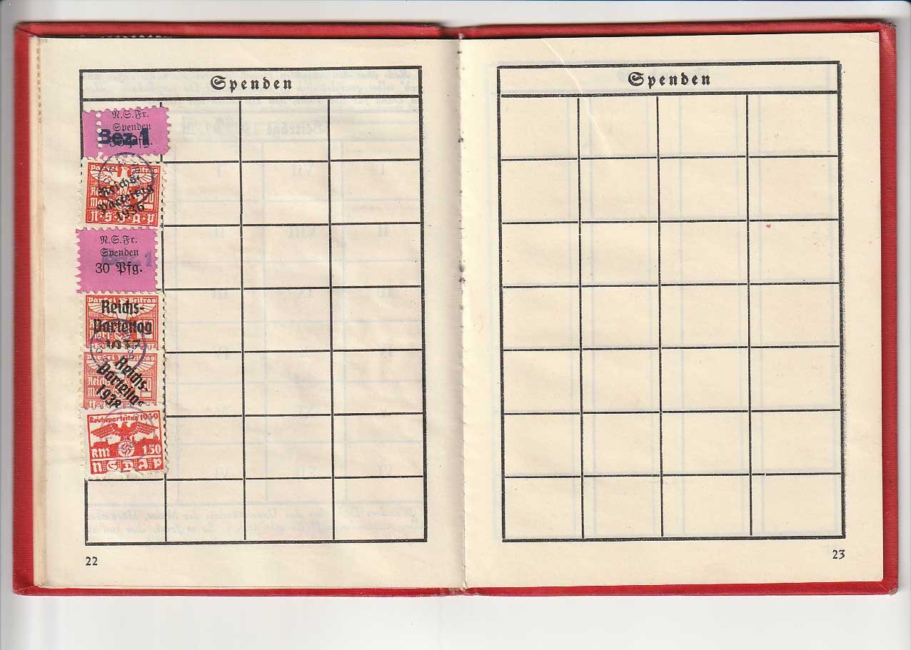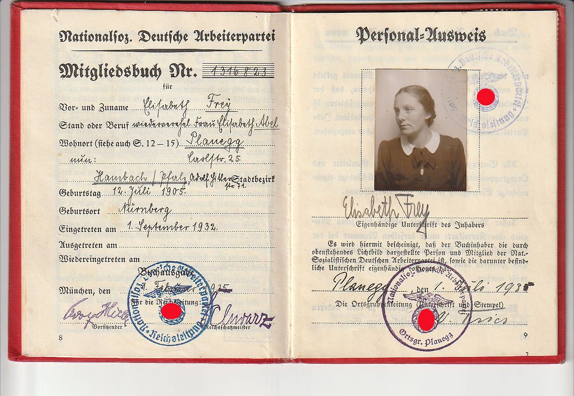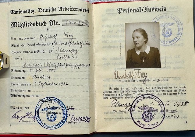NSDAP Mitgliedsbuch or membership book for a woman. All pages complete and intact, Elisabeth Frey joined October 1, 1932 with member number 1,316,823. Nice condition