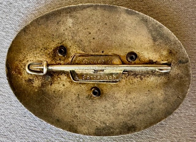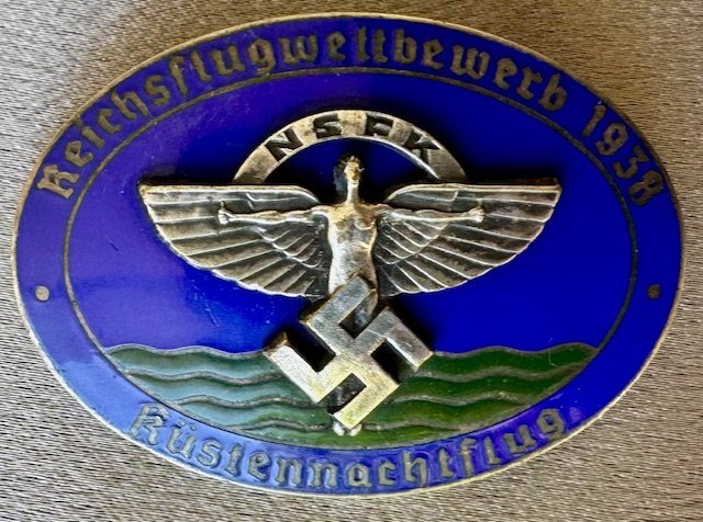 NSFK Reichsflugweltbewerb 1938 Küstennachtflug. Silver white alloy with medium blue enamel and a separately applied NSFK emblem. Maker marked "D. Fechler Bernsbach" on the back. Heavy metal pinback, 54mm X 39mm, excellent condition