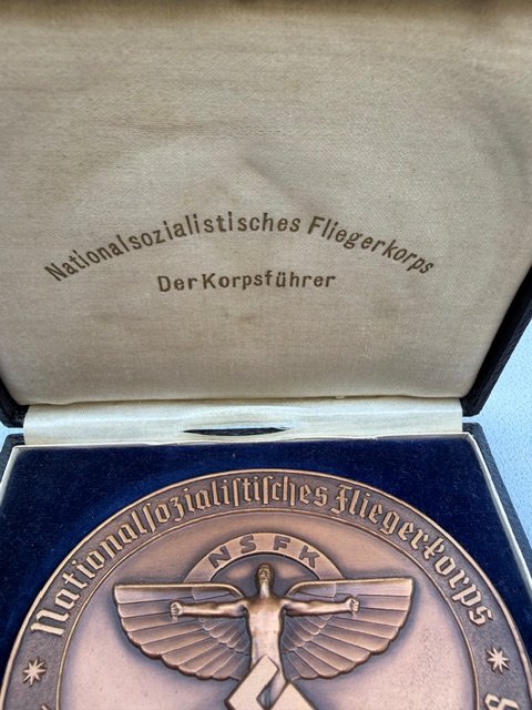 “Nationalsozialistisches Fliegerkorps 19. Rhön-Segelflug-Wettbewerb 1938” , indicating this was awarded for achievement in a glider competition. The reverse inscription translates to “In lock step with our Führer, we fly for our eternal Germany,” with the signature of NSFK leader General der Flieger Friedrich Christiansen and numbered "446". Medallion is approx. 95mm x 77mm, case is in excellent condition.