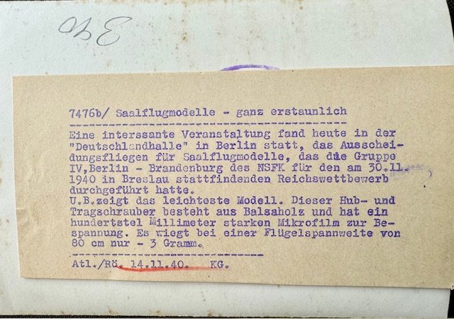 "Indoor flight models are quite astonishing. An interesting event was held today in the Deutschlandhalle in Berlin, the qualifying flight for indoor flight models, which the Group IV Berlin-Brandenburg of the NSFK had organized for the national competition taking place on 30.11.40 in Breslau. Young man shows the lightest model. This helicopter and gyroplane is made of ballast wood and has a hundredth of a millimeter thick microfilm for covering. It weighs only 3 grams with a wingspan of 80 cm. Press photo, approx. 5" X 7" in size