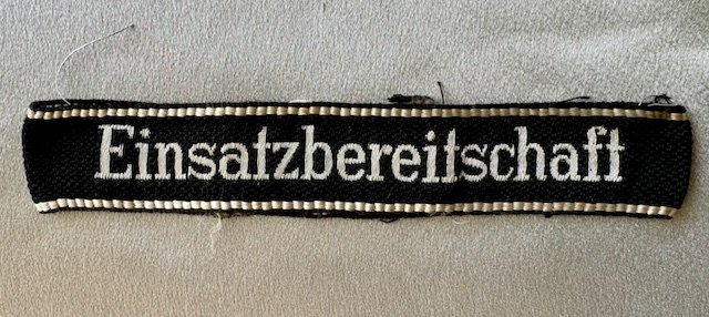 Rare NSKK Einsatzbereitschaft Cuff Title, tunic removed, Bevo metal thread woven version in the same design as for the Waffen-SS. Sewn at the back, overall length approx. 15"