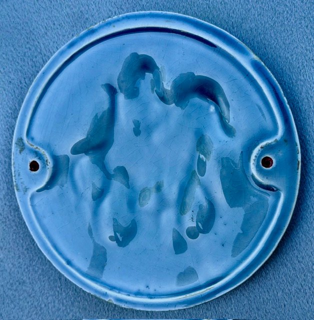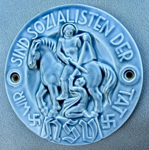 "NSV Wir sind Sozialisten Der Tat" (NSV - We are Socialists of Action), glazed gray blue porcelain plaque, 105 mm in diameter, with holes for mounting on a door or wall