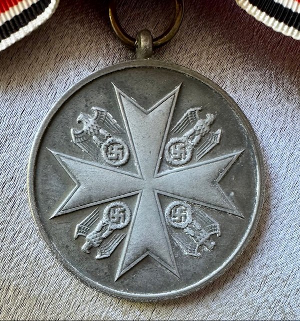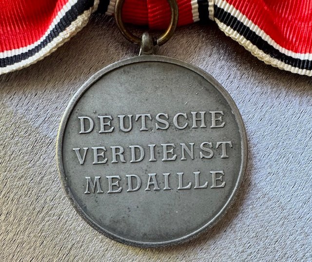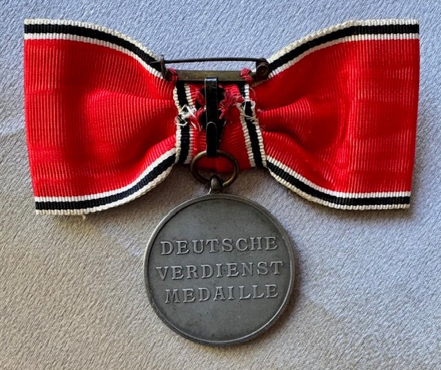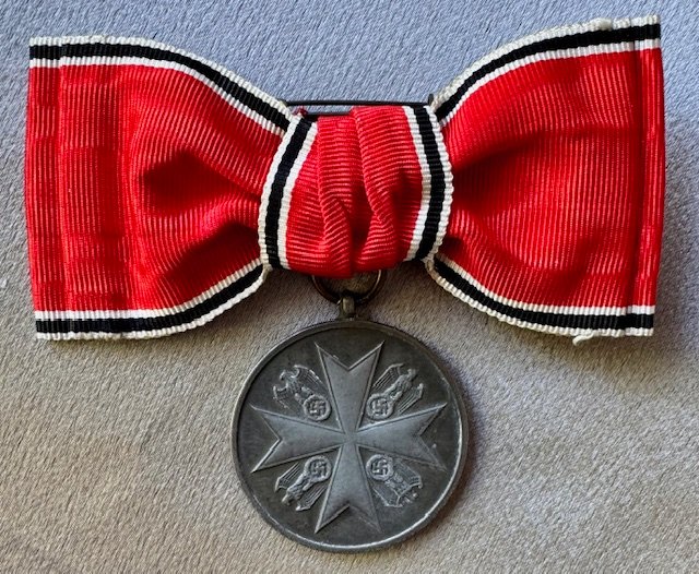 Woman's Order of the German Eagle Merit Medal, 2nd type, latin script 1943-1945, on original pinback bow ribbon; marked "30" on ring, in fine condition.