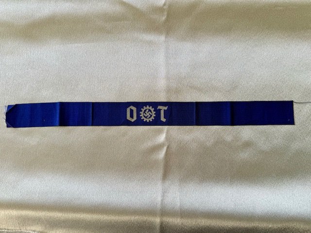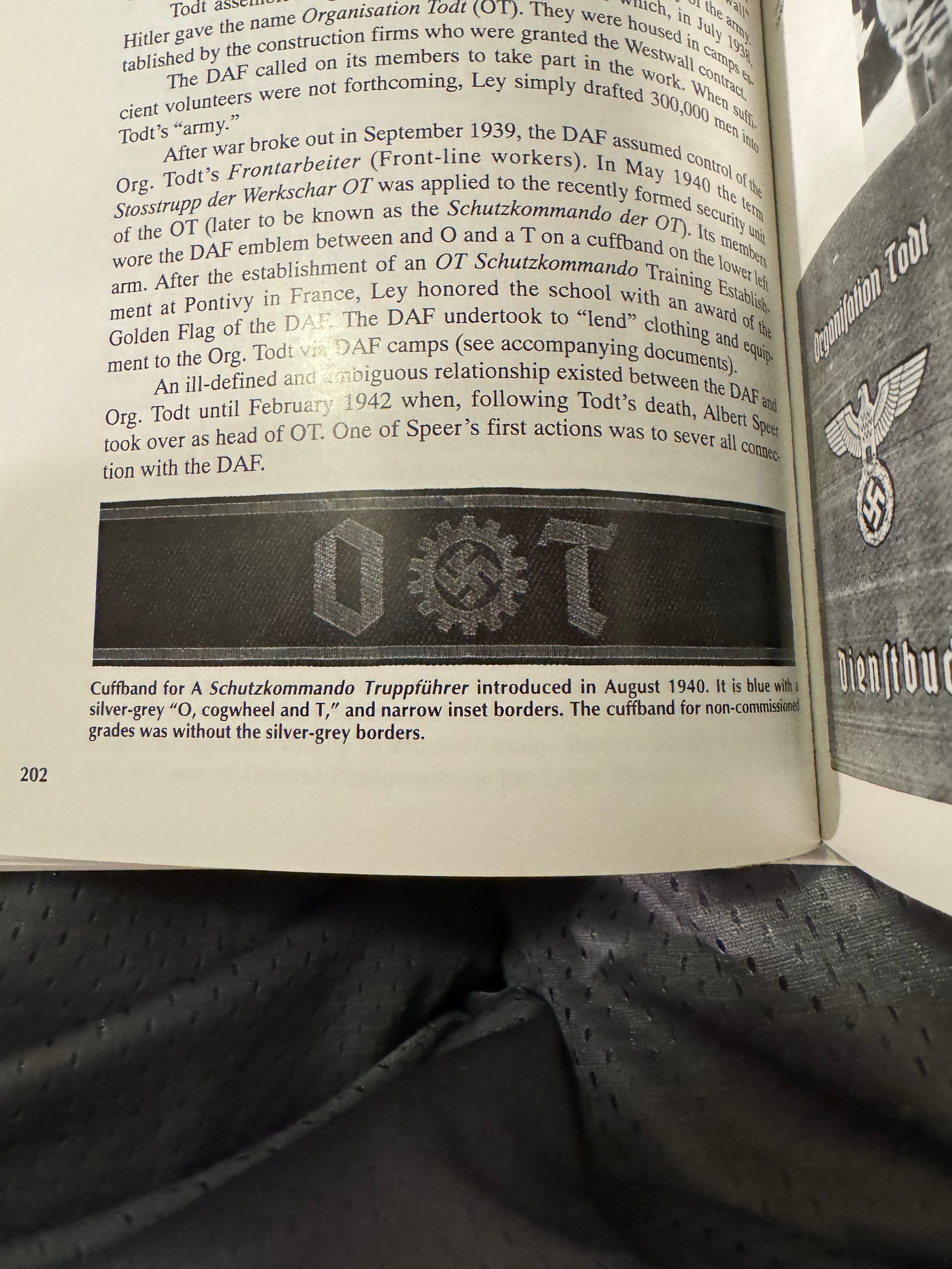 Org. Todt Protection Command Squad Leader Cuff Title, bevo, just over 15" in length. Heavily reproduced, real examples like this are seldom seen for sale. As seen on page 202 of Angolia's Labor Book