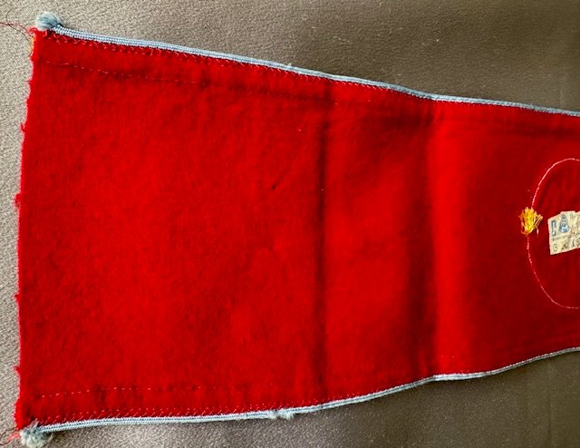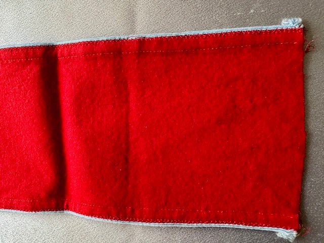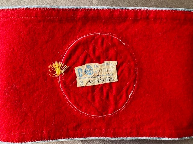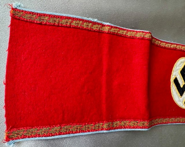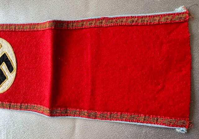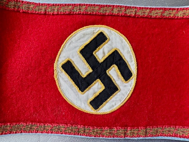 Multi-piece red wool with central, white, ribbed rayon circular field with canted, black rayon tape swastika. Both white circular field and swastika bordered in gilt thread piping. Applied to outer edges is a machine woven, horizontal strip of repeating gilt 7mm flat-wire oak-leaves. Top and bottom of armband is bordered in light blue rayon piping. Length approx. 20"