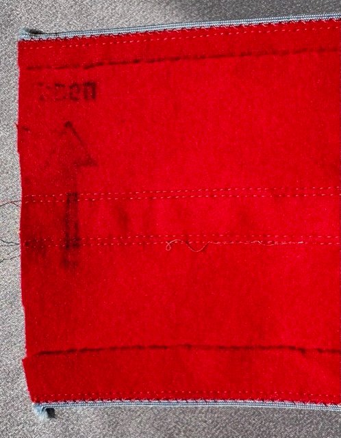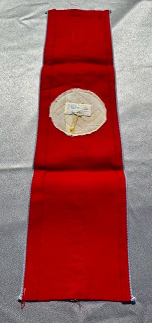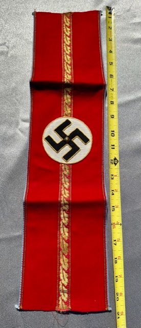 Orstgruppe Zellenleiter Betriebsobmann (C & D) Hauptbetriebsobmann Armband. Multi-piece red wool with central, white, ribbed rayon circular field with canted, black rayon tape swastika. Both white circular field and swastika bordered in gold thread and swastika has an alloy political style rank pip to center. Applied to center is a machine woven, horizontal strip of repeating gilt 13mm cellion oak-leaves, with 1 mm gilt wire piping. Top and bottom of armband is bordered in light blue rayon piping with a secondary 1mm gilt wire piping inset from outer edges. Complete with paper RZM tag, approx. 21" long. Choice example !
