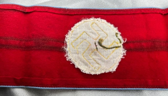 Armband for Ortsgruppe Blockleiter and Betriebsobmann (B). Bullion oakleafs (10mm) with black ribbon swastika and pip at center. Highest quality construction and bullion work. Approx. 20" in length.