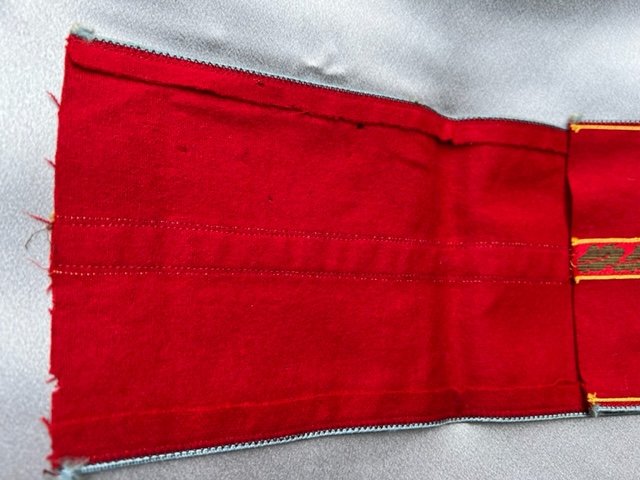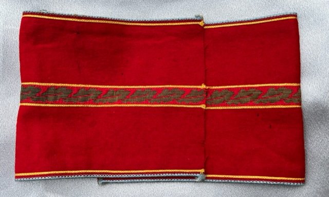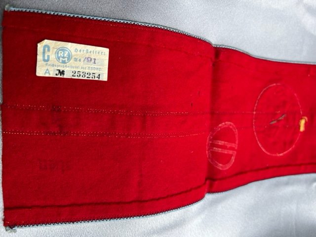 Ortsgruppe Zellenleiter Betriebsobmann (C & D) Hauptbetriebsobmann Armband. Multi-piece red wool with central, white, ribbed rayon circular field with canted, black rayon tape swastika. Both white circular field and swastika bordered in gold thread and swastika has an alloy political style rank pip to center. Applied to center is a machine woven, horizontal strip of repeating gilt 13mm cellion oak-leaves, with 1 mm gilt wire piping. Top and bottom of armband is bordered in light blue rayon piping with a secondary 1mm gilt wire piping inset from outer edges. Complete with paper RZM tag, approx. 21" long. Excellent example !