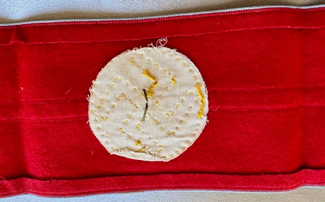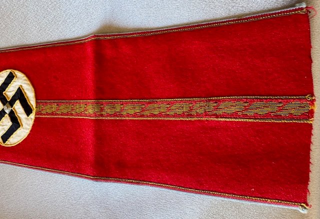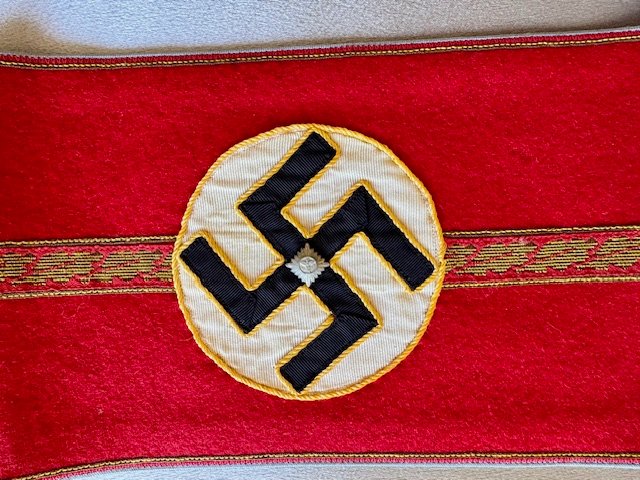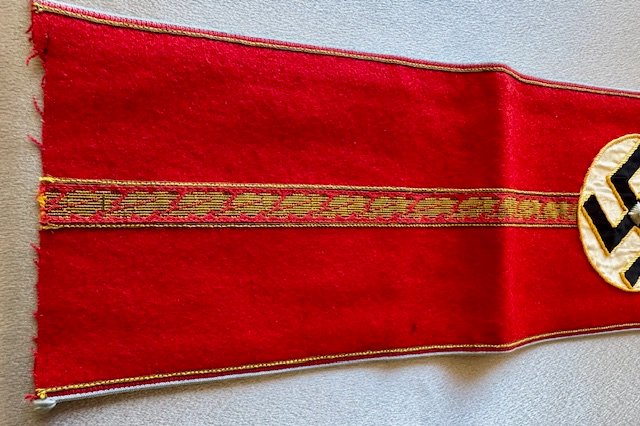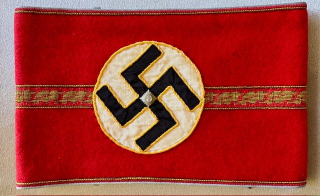 Armband for Ortsgruppe Zellenleiter and (C und D) Hauptbetriesobmann. Bullion oakleafs with black ribbon swastika and pip at center.