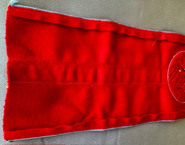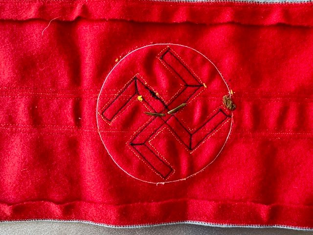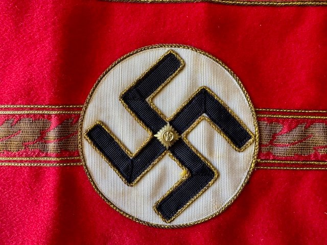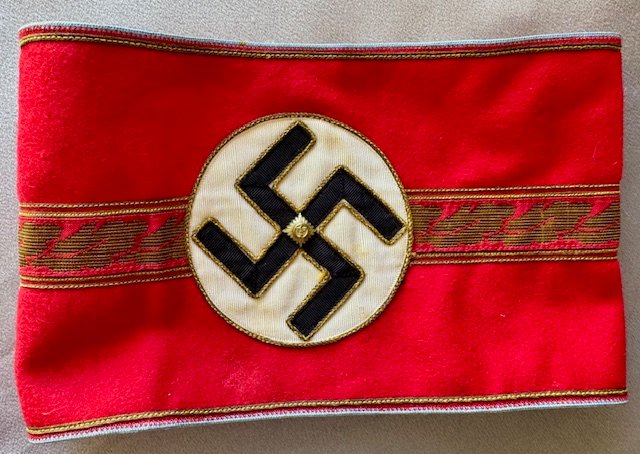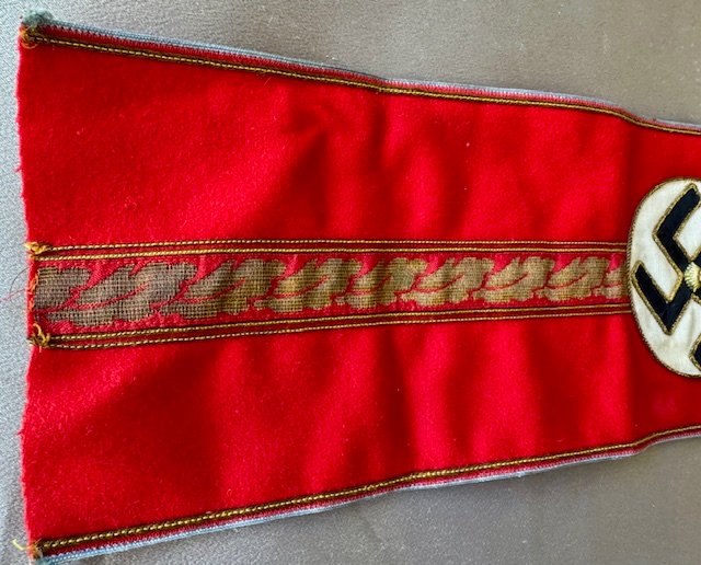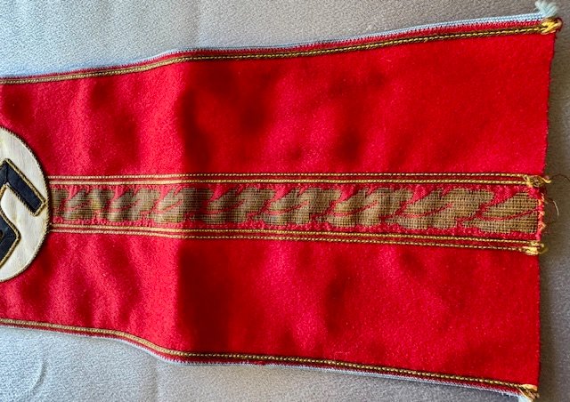 Armband for NSDAP Ortsgruppenleiter. Bullion oakleafs with black ribbon swastika and pip to center. Nice example of highest leader at the Orts level. RZM tag to reverse, just under 20" in length