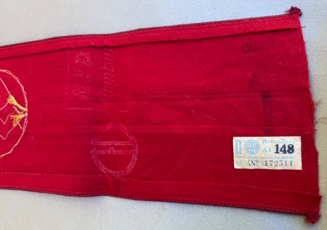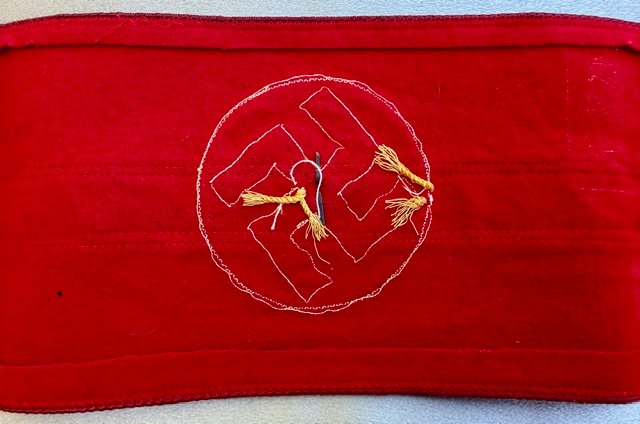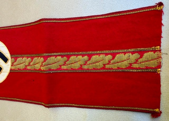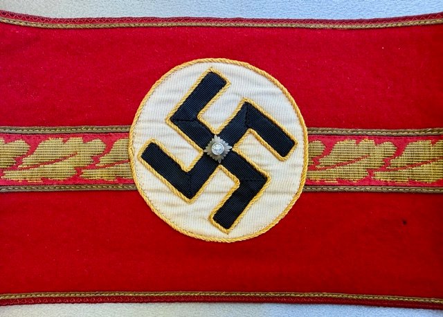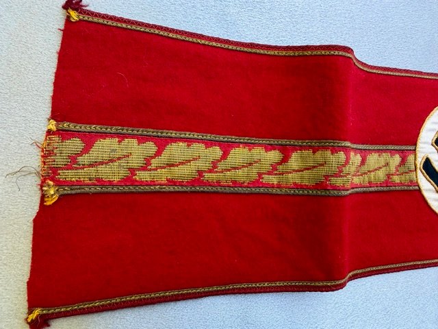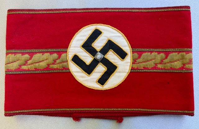 Armband for NSDAP Deputy Gauleiter. Bullion oakleafs with black ribbon swastika and pip to center. Nice example of 2nd highest leader at the Gau level. "Oben" arrow and RZM tag to reverse, just over 20" in length