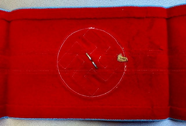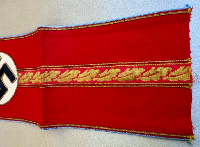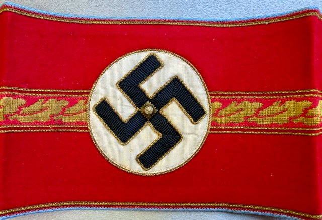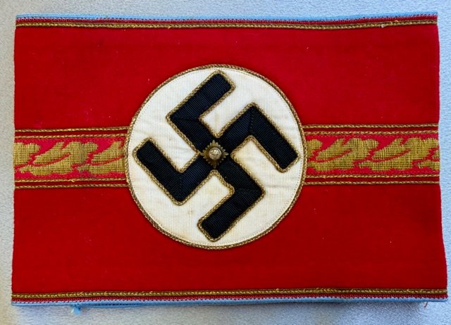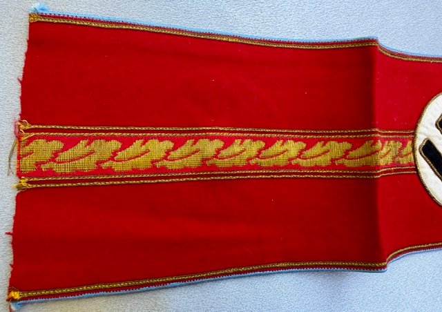 Armband for NSDAP Ortsgruppenleiter. Bullion oakleafs with black ribbon swastika and pip to center. Nice example of highest leader at the Orts level. RZM tag to reverse, 21" in length, near mint