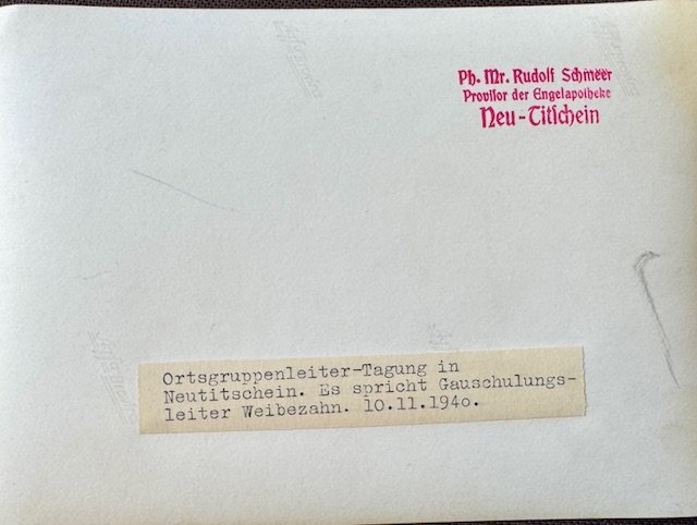 Ortsgruppenleiter meeting in Neu-Titschein. District training leader Weibezahn will speak. Period photo, 7" X 5"