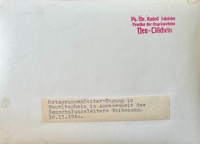 Ortsgruppenleiter meeting in Neu-Titschein. District training leader Weibezahn will speak. Period photo, 7" X 5"