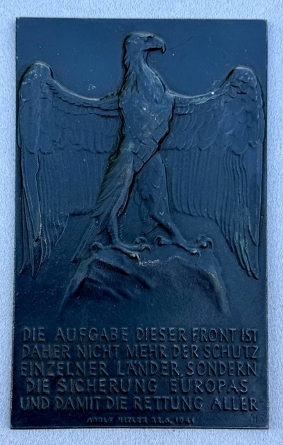 Patriotic Cast Iron Plaque With Motto of Adolf Hitler the reads "The task of this front is therefore no longer the protection of the individual countries, but the security of Europe and thus the rescue of all of them". Adolf Hitler June 22, 1941", approx. 90mm X 145mm