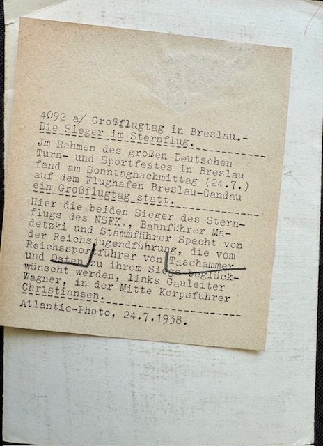 "Here are the two winners of the NSFK star flight, Bannführer Madetzki and Stammführer Specht from the Reich Youth Leadership, who are congratulated on their victory by the Reich Sports Leader von Tschammer and Osten, on the left Gauleiter Wagner, in the Mitte Corps Leader Christiansen", Breslau on July 24, 1938, press photo, 7" X 5" in size