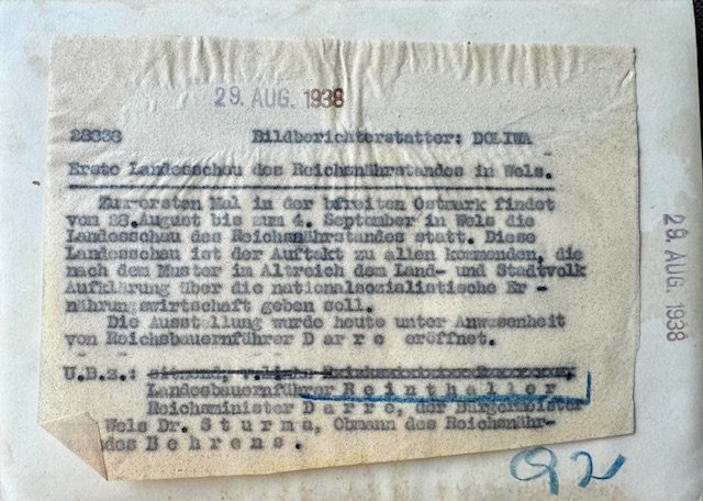 Reichsleiter Walther Darré in Wels on August 29 1938 for Reich Nutritionists meeting. Period press photo, approx. 7" X 5"