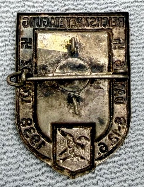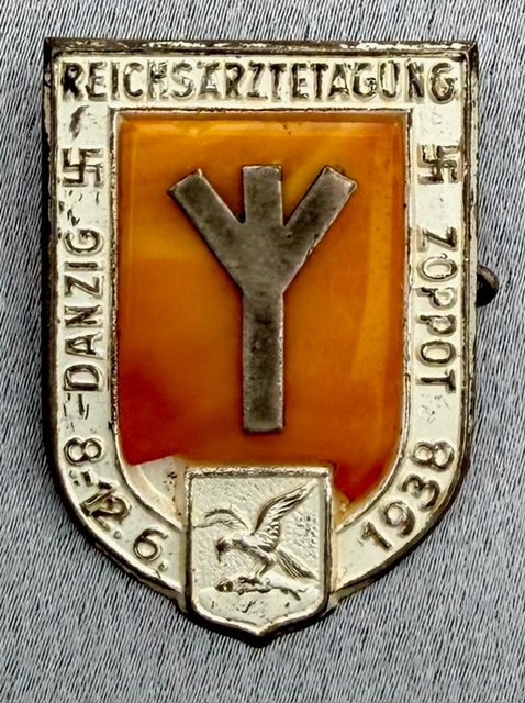"Reichsärztetagung Danzig Zoppot 8-12. 6. 1938" Tinnie. Metal pinback with amber stone, 26mm x 37mm. Rare tinnie for a medical conference held in the spa village of Zoppot outside Danzig.