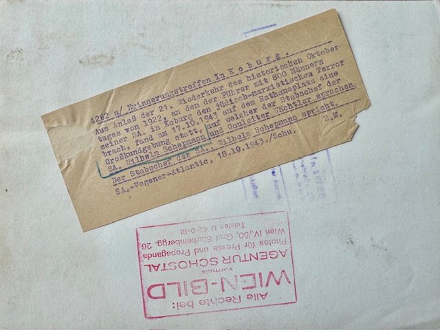 Remembrance meeting in Koburg on Oct 18, 1943. SA Stabschef Schepmann speaking with Gauleiter Wächtler looking on. Press photo, large size approx. 7" X 9 1/2" in size