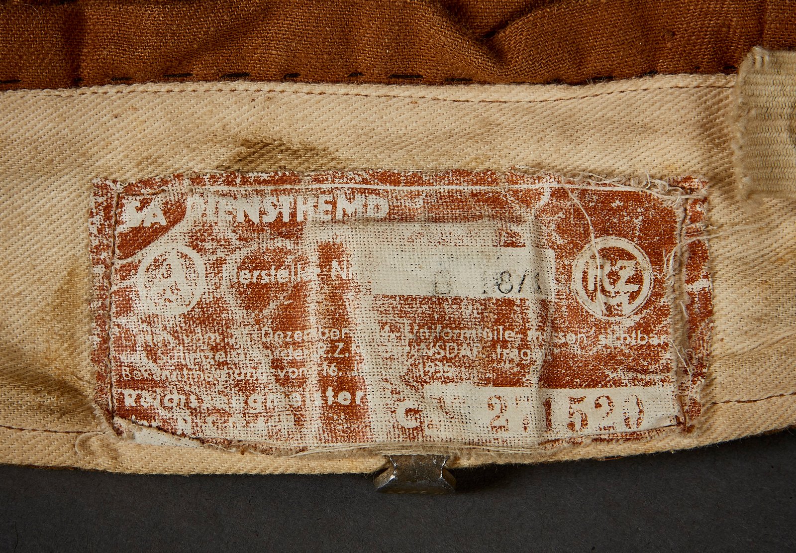 Sturmabteilung Braunhemd. Rank for Sturmführer of Standarte 136 of Brigade 71, SA Group Niederrhein based in Köln. Double 4mm sleeve stripes indicate joining SA between January and December 1931. Grey underlay of the bullion shoulderboard indicates an SA foot unit. This brownshirt is in excellent condition, having only been in one other collection since the war.