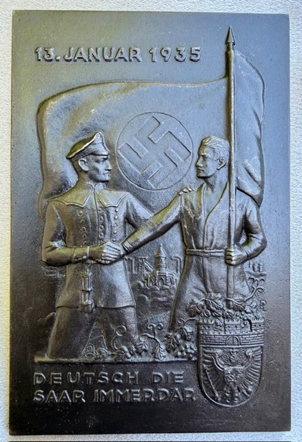 Saar Reunification Plaque, "13. Januar 1935 Deutsch die Saar Immerdar", maker marked to reverse, metal, approx. 100mm X 142mm