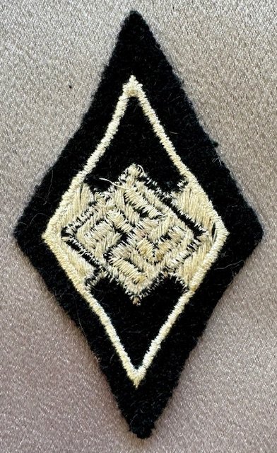 SS Sleeve Diamond for Former Members of the Hitler Youth. Black cloth backing, white machine embroidered Hitler Youth triangle.