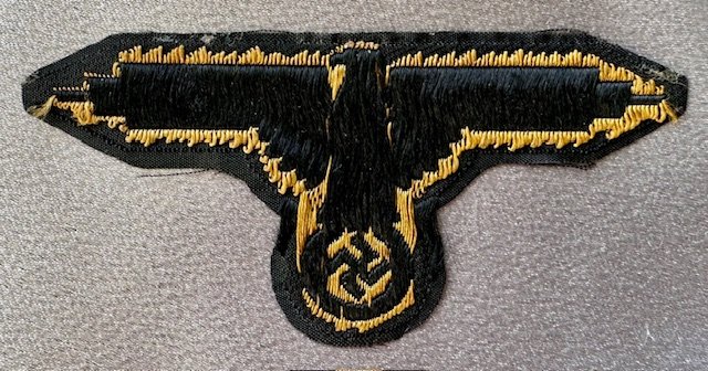 Brown colored flat woven "BeVo" style Waffen SS cap eagle for a camouflage cap autumn side. These insignia were double mounted having a green eagle on the spring side and a brown one on the fall side. The piece remains in mint condition.
