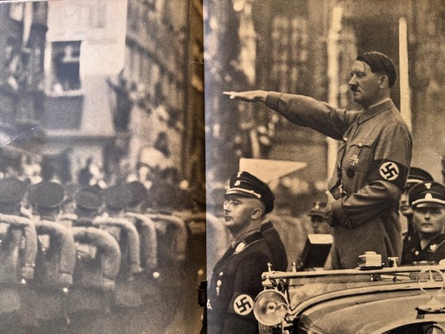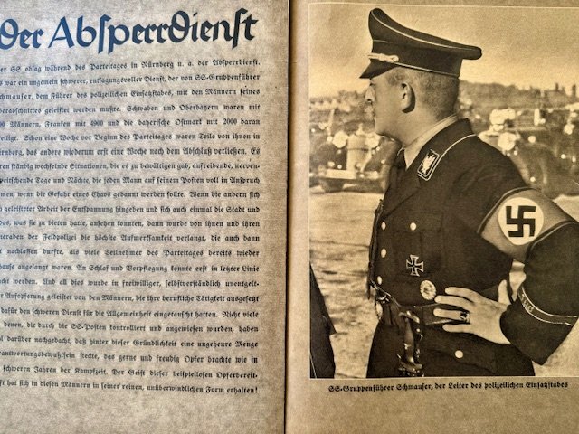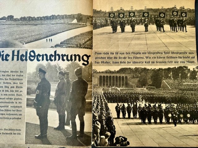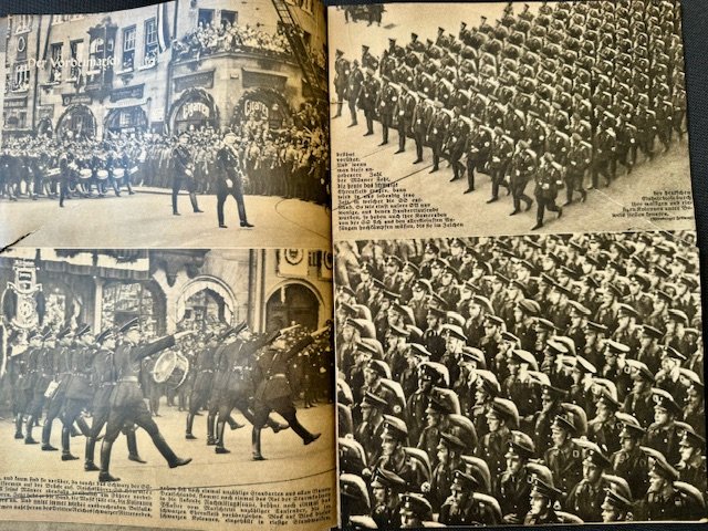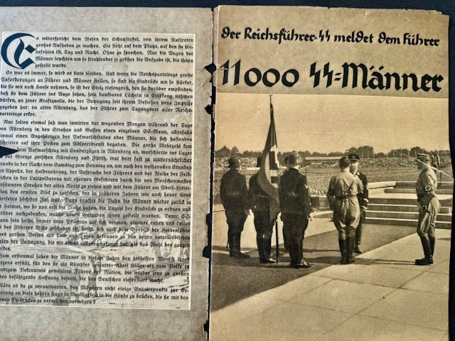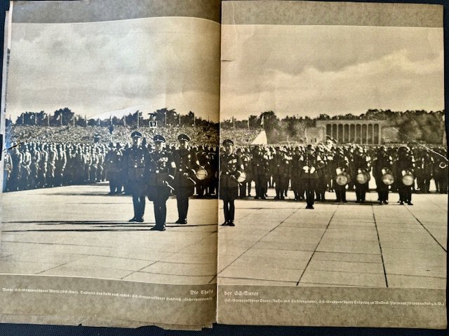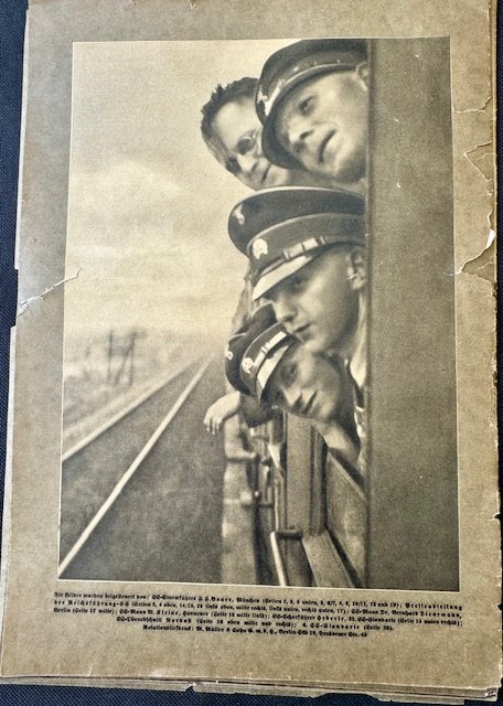 SS FM Zeitschrift Magazine, first year publication, volume 7 edition of FM Zeitschrift for contributing members of the SS. Original example of the 8 x 11-3/8 inch heavily illustrated monthly magazine. These rare magazine were published in Berlin by Reichsführer SS Heinrich Himmler for the Fördernte Mitglieder or patron members of the SS. All pages present, some torn and loose, very rare to find