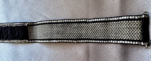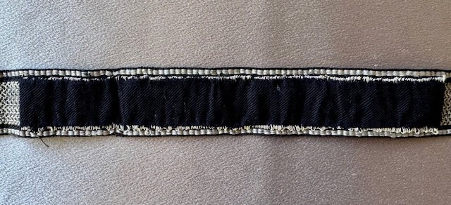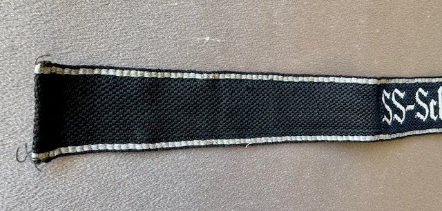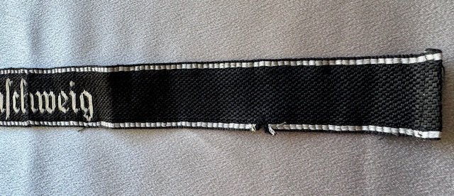 SS Officer Candidate School at Braunschweig Cuff Title. Black band with silver aluminum 6 thread borders, at center "SS Schule Braunschweig" flat wire machine embroidered in silver aluminum Gothic script, just over 18" in length, came off a tunic. Rare