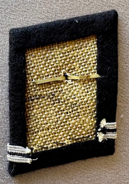 SS Scharführer Collar Tab, black cloth backing, single grey metal pip at center with single strip of silver aluminum litzen with black center stripe.
