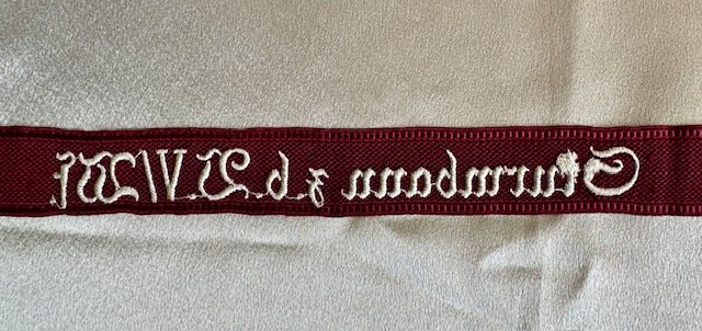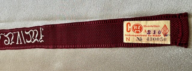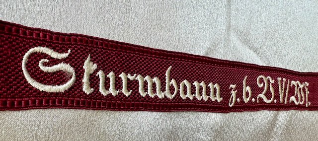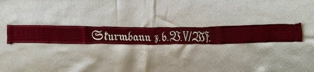 Honorary cuff title for Sturmbann 5 Westfalen. This came out of an old collection and had an HJ RZM tag on the reverse. This is a full length example measuring 19? long in mint condition,