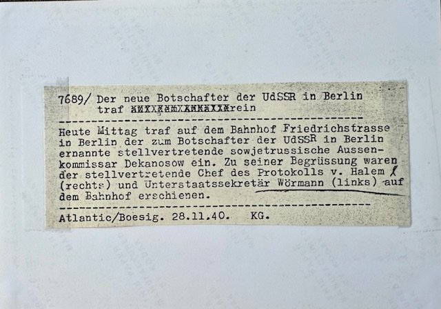 Undersecretary of State Ernst Woermann, Ambassador Vladimir Georgewitsch Dekanozov, 'Legationsrat' (attache) von Halem and the ambassadorial counsellor in the Soviet Embassy in Berlin. Vladimir Semyonov, who would later become the ambassador of the USSR in Bonn, (from left) at the Friedrichstrasse station in Berlin. Print of press photo, approx. 5" X 7"