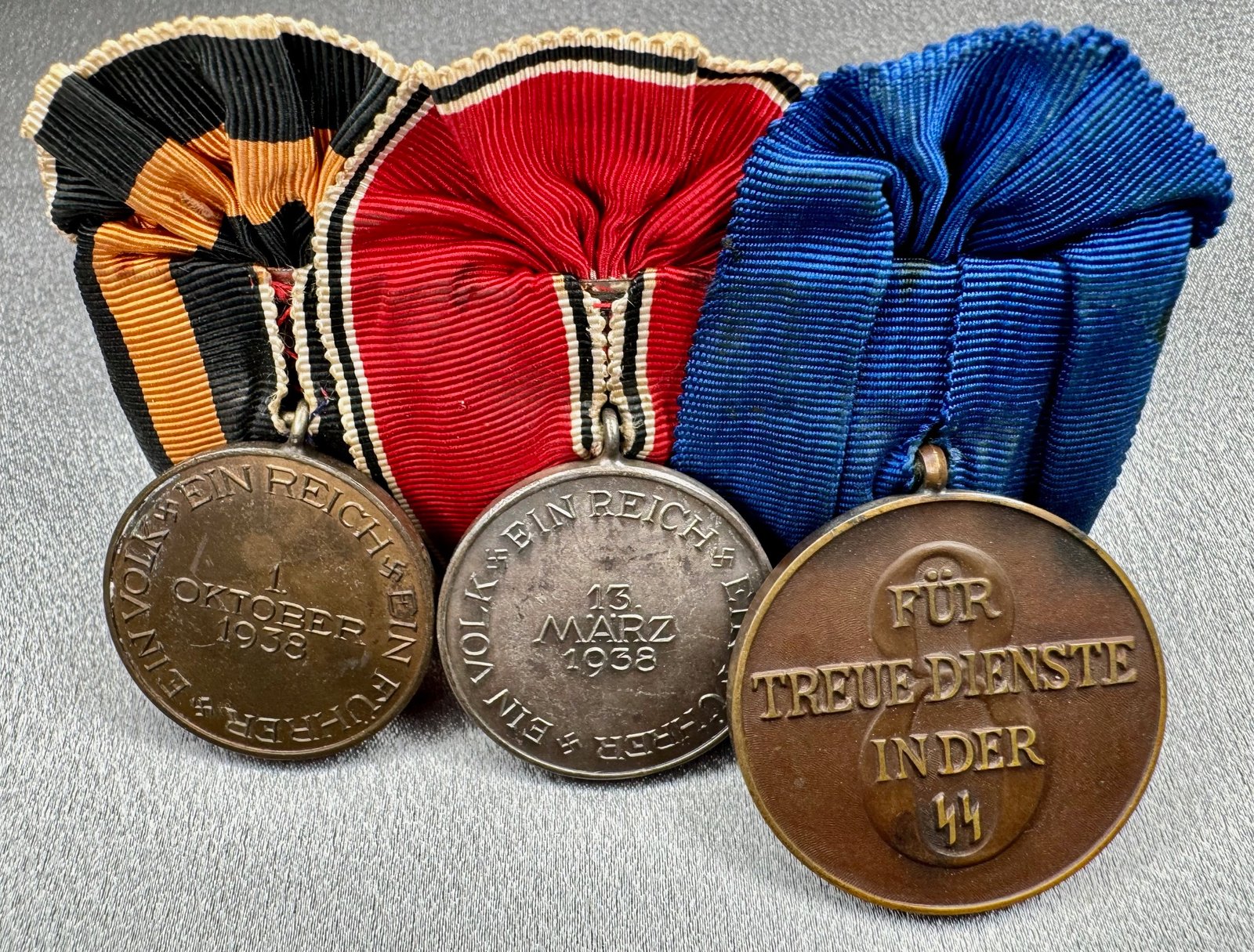 Three Medal Parade Bar: SS 8 year long service, Entry into Austria, and Entry into Sudeten. Excellent condition