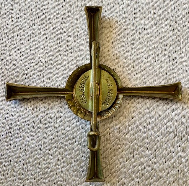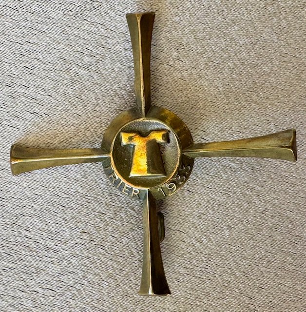 Trier 1934 Tinnie, metal pinback, pin marked "GES. GESCH." twice, 46mm x 46mm
