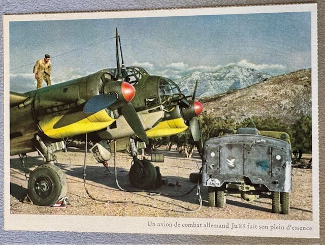 Un avion de combat allemand JU88 fait son plein d'essence, period French postcard