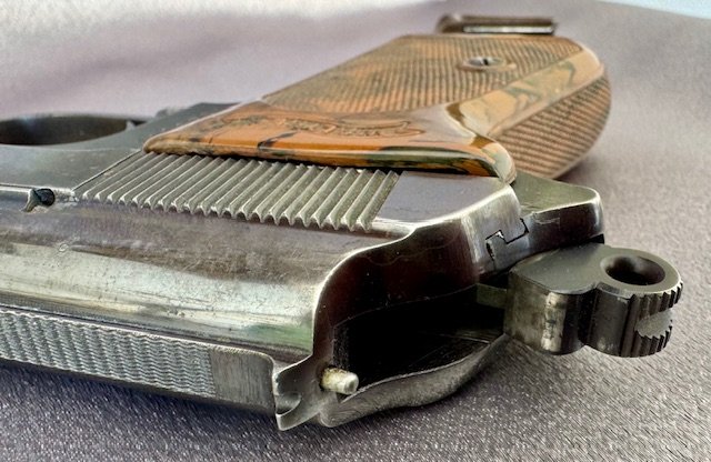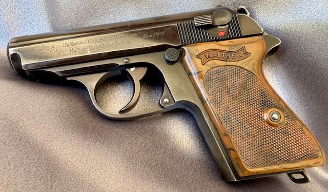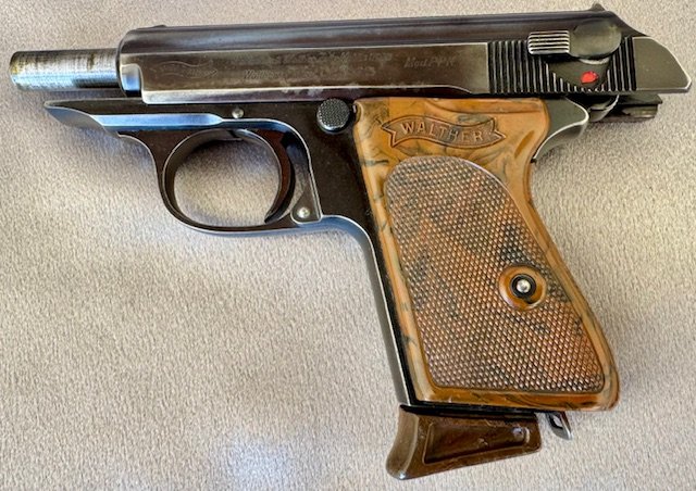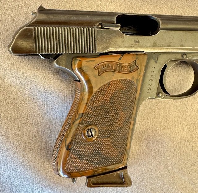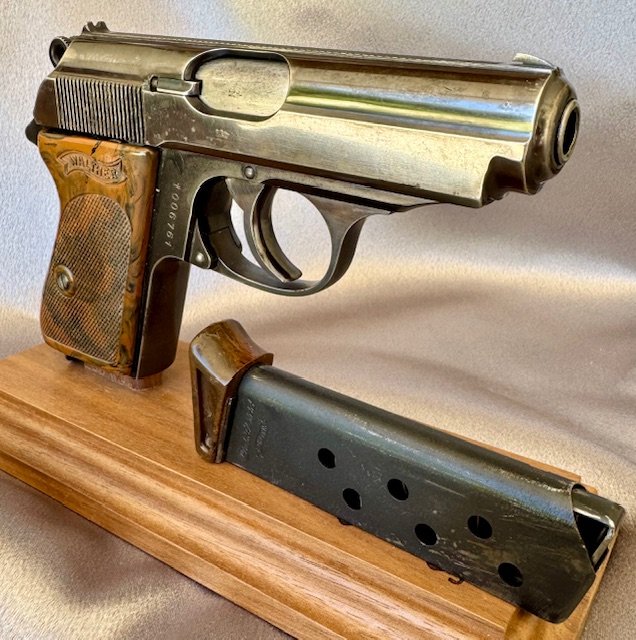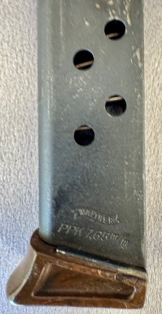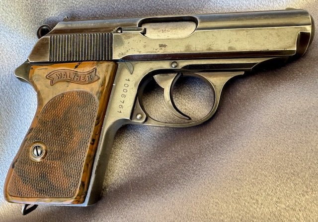 Walther PPK Pistol Million Series. There were only about 7000 of these made before they added the K suffix. The pistol has 85% of the original blue, with standard muzzle wear, and a spot of finish loss on the rear, excellent bore. Excellent grip and finger extension Walther banner marked magazine , both without cracks or chips.