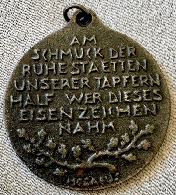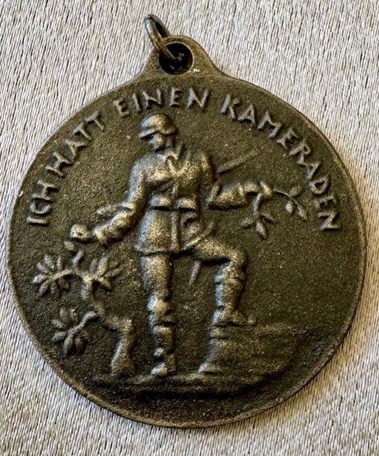 Weimar Medal. Front has a soldier with the words "Ich hatte einen Kameraden", reverse reads "Am Schmuck der Ruhestätten unserer Tapferen half wer dieses Eisenzeichen nahm" with the artist name below, metal, 33mm