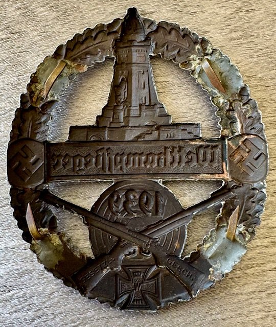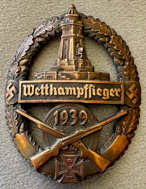 "Wettkampfsieger 1939" (Competition winner) with wreath and swastikas surrounding Kyfhäuser monument, metal with 4 intact prongs the reverse, 51mm x 64mm, uncommon